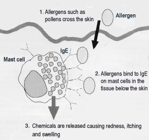 The cause and development of this disease has not yet been completely clarified. In dogs the organism generates antibodies of the type IgE (immuglobulin E) against normally harmless substances such as house dust mites, pollen, grasses, insects, animal hair and others. The allergy-causing substance, the allergen, is absorbed through the skin (percutaneously). The allergens bind to copiously produced IgE antibodies which coat specific defence cells (mast cells). The mast cells thereupon release chemical substances causing itching, redness and swelling. The most common allergens are house dust mites and pollen.