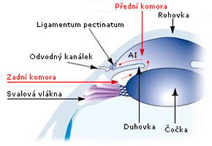 | – | a odtud tzv. komorovým úhlem (angulus iridocornealis, AI), který je tvořen rohovkou a duhovkou, |