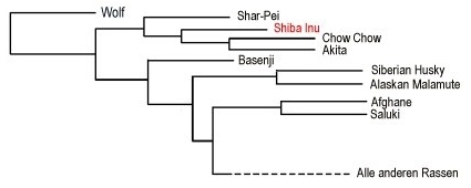 Die "alte" Gruppe umfaßt nur 9 verschiedene Rassen aus ganz unterschiedlichen Erdteilen. Die größte genetische Nähe zum Wolf wiesen in dieser Gruppe der Shar-Pei, der Basenji und der Shiba Inu auf. In der folgenden Zeichnung ist der ganze Zusammenhang graphisch dargestellt:
